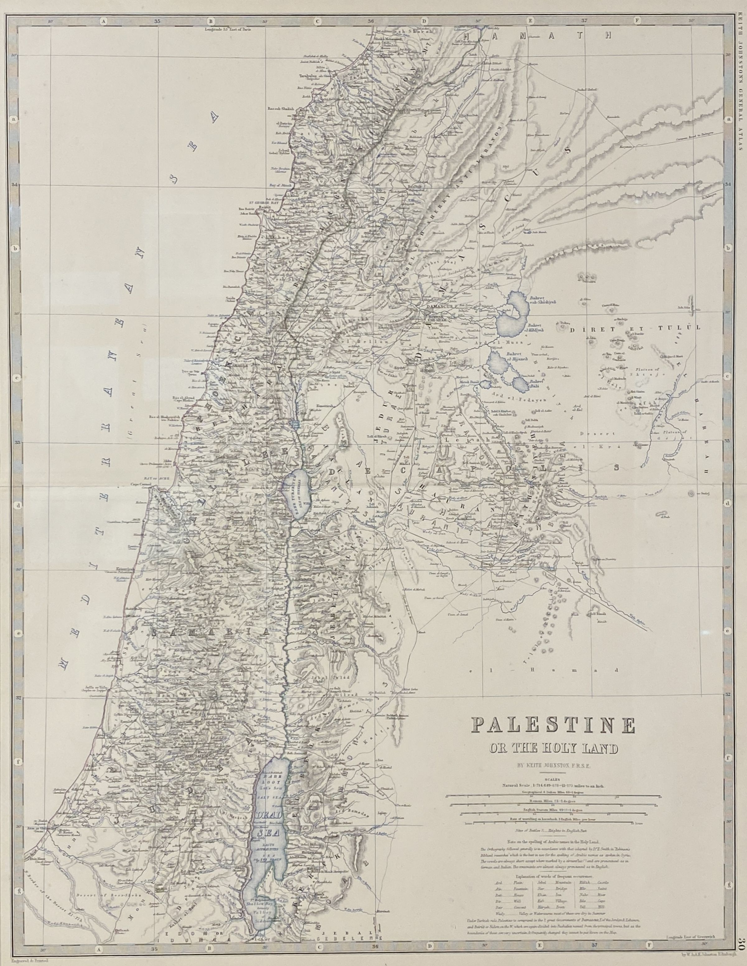 This large-scale map was produced by Geographer to the Queen of Scotland, Alexander Keith Johnston for the "Royal Atlas of Modern Geography." The outlines on this map of Palestine are hand colored. There are numerous Biblical maps produced throughout the centuries, depicting Palestine through the Holy Land lens. In Johnston’s map, one can see the original Arabic transliterated place names, as well as the Twelve Tribes of Israel.